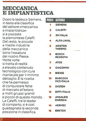 (图片:机械设备行业:在机械设备行业排名中,皮埃蒙特企业卡莱菲排名第二,仅次于德国西门子。排名中其他中小型机械行业的企业均是意大利的知名企业。很多大型小型集团能够获得世界市场的份额,秘诀在于关注细节及技术问题。在众多行业的领先企业之中,卡莱菲就是如此获得排名第二的位置的。
