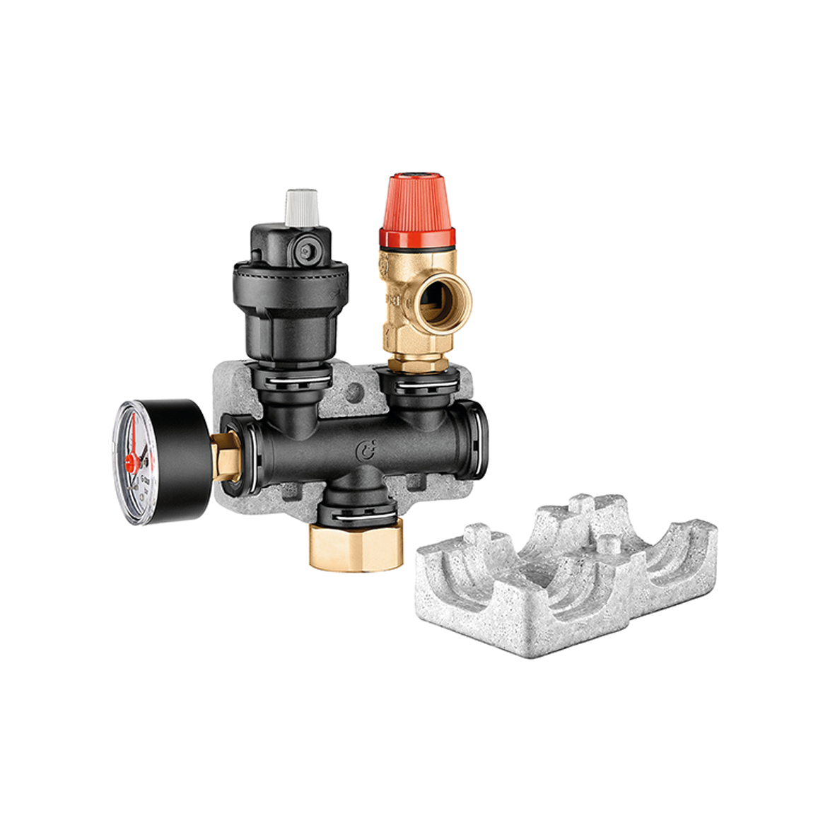 卡莱菲,305671。热泵安全组件。带保温壳。包含:- 自动排气阀;- 安全阀;- 压力表。口径:G 1" (ISO 228-1) F。耐温:5–90 °C。耐压:1.8 bar。最大泄压功率: 50 kW。